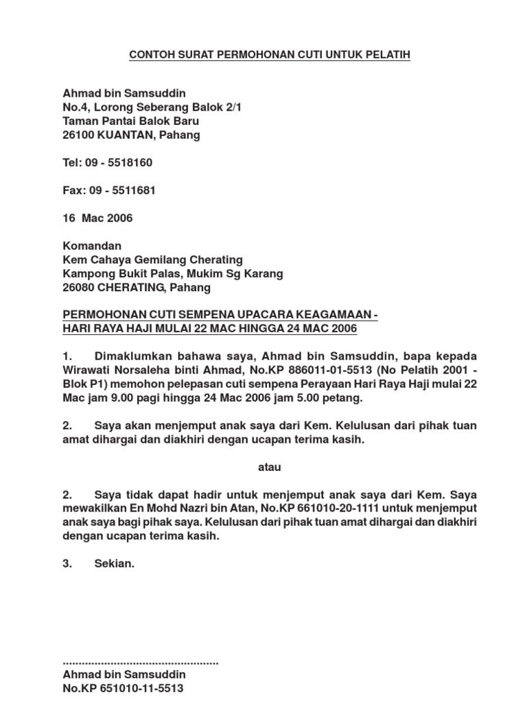 Contoh Surat Memohon Cuti Sekolah Pdf